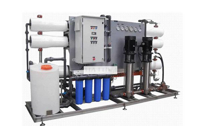 原水(設有壓力保護)→增壓泵(一用一備)→砂過濾器→炭過濾器→硬化器(根據地區不合選用)→緊密過濾器(或稱保安過濾器)→兩頭水箱→一級RO高壓泵→一級RO反滲透零碎→RO水箱→二級RO高壓泵→二級RO水箱→增壓泵→EDI(CEDI)電去離子水(指除去了呈離子方式雜質后的純水)主機→去離子水(指除去了呈離子方式雜質后的純水)箱→去離子水(指除去了呈離子方式雜質后的純水)泵→拋光混床→終端緊密過濾→UV紫外線殺菌→設備用水(水質可以達到18MΩ.cm以上即0.055 μs/ ㎝以下,25 ℃)
