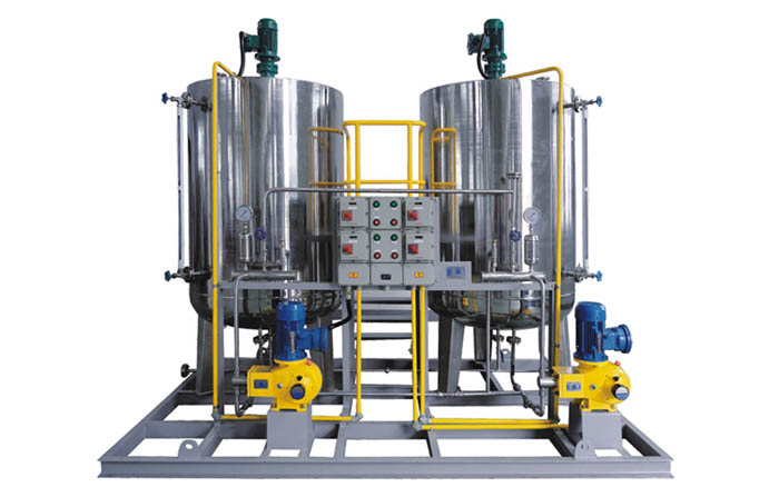 本裝置主要包括藥液計量泵系統、溶配系統、計量投加系統、安全系統和控制系統等五部分。