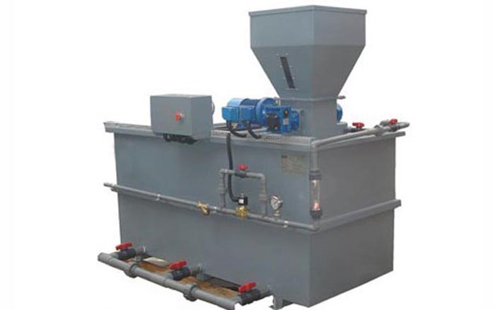 聚合物溶液制備過程是通過各個溶液箱分級逐步處理完成的.溶液箱之間隔開。保證每個溶液箱內的最佳反應時間和恒定的濃度.避免在預制箱和最終溶液箱之間產生任何直接通路。該設備由控制箱自動控制.此控制箱與安裝在最終溶液箱上的液位計相連.一旦液位達到“低位”,觸發電動進水閥打開。觸點式流量計就啟動干投機.干投量的大小按照水量而定,以獲取精確的濃度,一旦達到“高位”此循環過程就停止。當然兩(或三個)攬拌器還在工作。該設備還用于將乳膠狀的陽離子、陰離子或無離子型的聚合物連續自動的制成標準稀釋濃度(0.3-5g/L)的溶液。盡管一般認為乳膠狀的聚合物制成標準溶液所需的熟化時間大大少于粉粒狀聚合物,但是在將藥耗達到最佳狀態過程中總是推薦要充分的熟化時間。