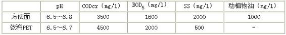 廢水來源為:方便面生產廢水:100 m3/d;飲料(PET)生產廢水:300 m3/d;員工生活廢水:150 m3/d。設計廢水水量為600m3/d。